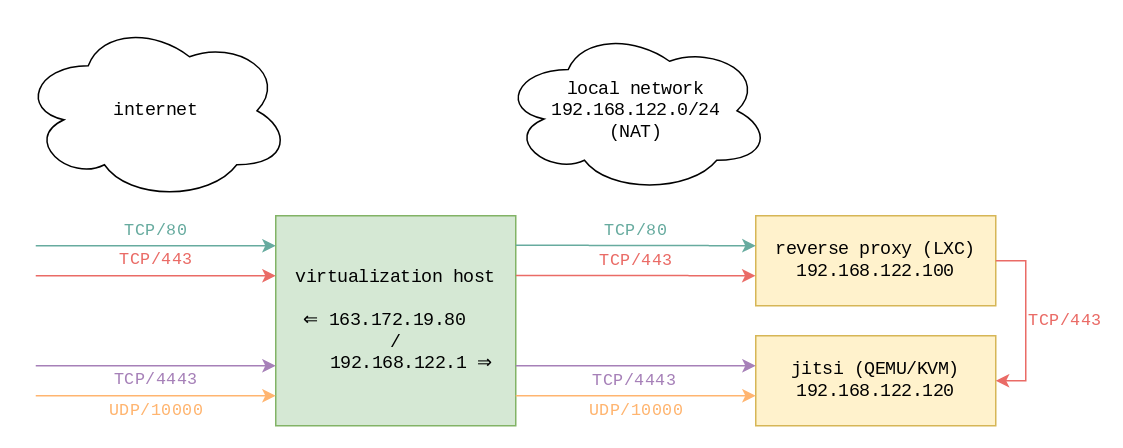 Jitsi itself was installed on a QEMU/KVM virtual machine, running a basic Debian 10 (buster) system, initially provisioned with 2 CPUs, 4 GB RAM, 3 GB virtual disk. Its IP address is 192.168.122.120, which is what was configured as the target of the ProxyPass* directives in the previous section.